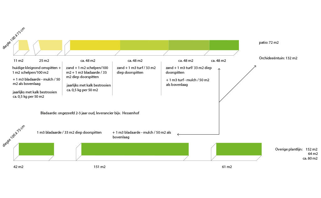 Langs de gevel van de kas is een langgerekt vak aangelegd met verschillende grondsoorten, zodat we verschillende orchideeën konden laten terugkomen. De orchideeën zijn gecombineerd met diverse andere plantensoorten.