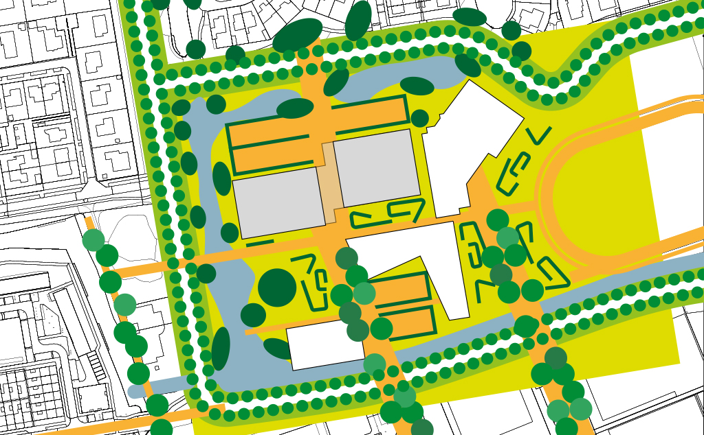 De groene aders vanuit de wijk ten noorden zijn sterk aanwezig rond het plangebied. Deze structuur wordt gekoesterd voor een betere waterhuishouding en mogelijkerwijs doorzetten langs de Flevostraat zodat er een heus campus eiland ontstaat.