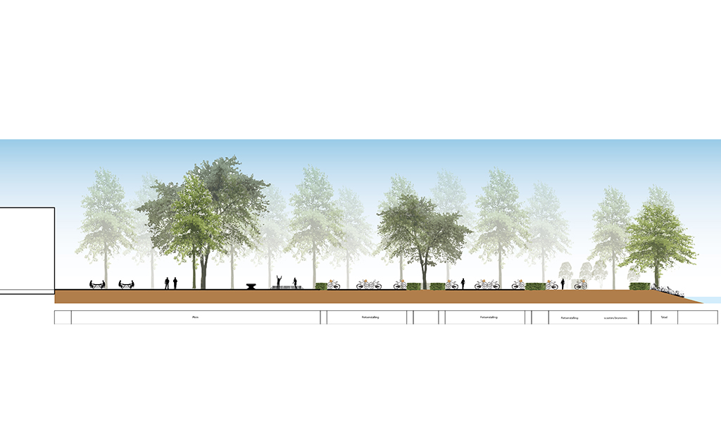Voor de meeste verharding en meubilair gaan we uit van hergebruik. De bestaande betontegels, schelpenverharding, betonranden, fietsenrekken en lichtmasten worden geoogst. Alleen de nieuwe entree loper krijgt een kwalitatieve nieuwe verharding met bijpassende banken van hout.