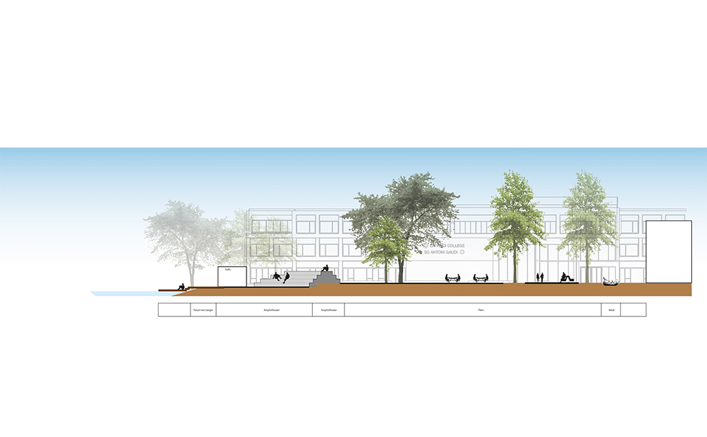 Het schoolplein is ingericht voor de middelbare scholier van Mavo tot VWO. Het plein kent diverse plekken van rust en beweging. Zijn plekken waar les gegeven kan worden in de buitenlucht voor kunst en biologie. Ook is ruimte voor experiment voor het technasium. Er is ruimte voor sport en beweging in de vorm van o.a. een daily mile met sportelementen. Ook is er een grote variatie aan zitaanleidingen, banken, tribune, podium en steigers.