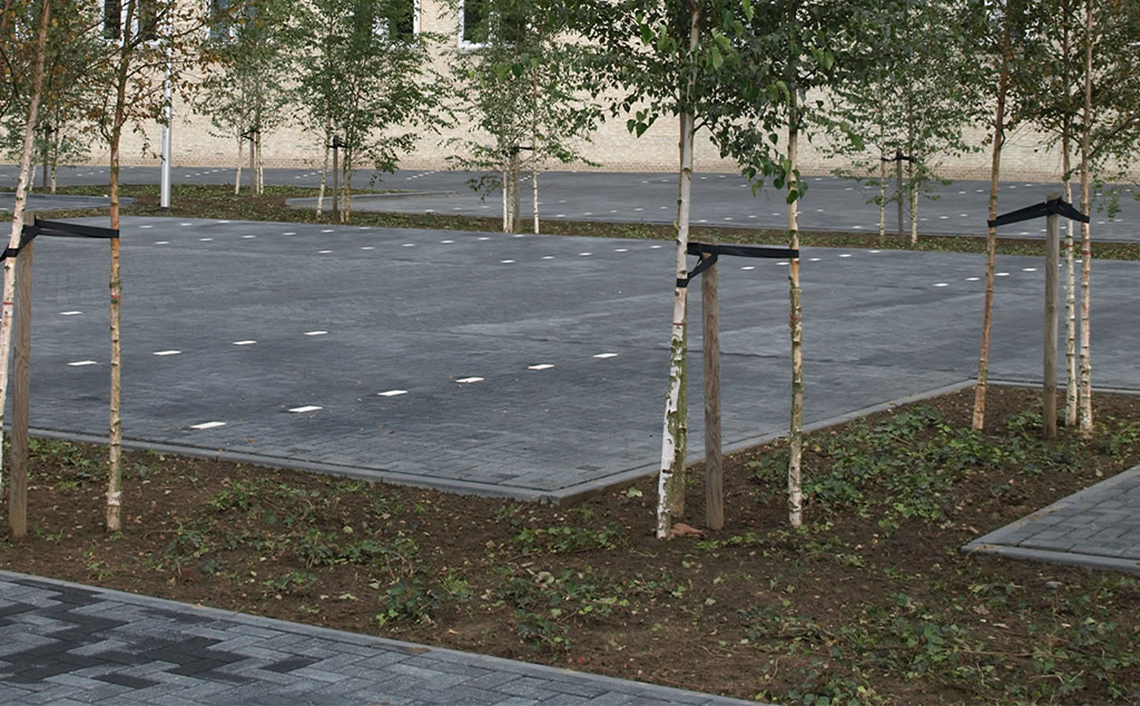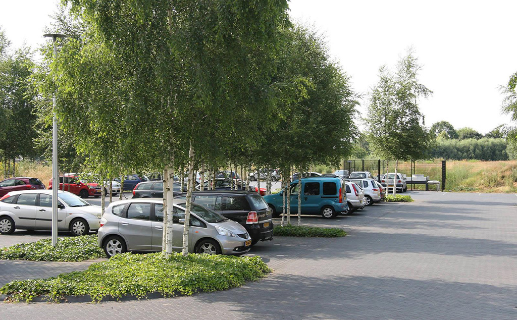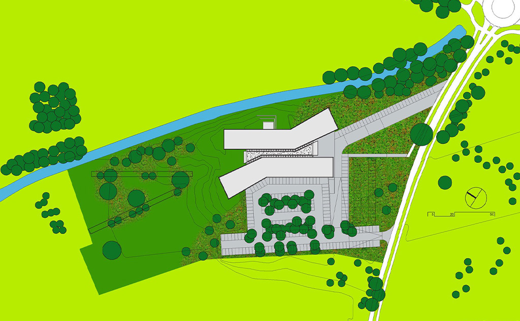 Het gemeentehuis ligt hoger dan de omgeving. Het voor terrein wordt ontsloten via een licht hellend vlak dat in het verlengde doorgaat in het lichte atrium dat het hart van het gebouw vormt. Hierlangs parkeren de bezoekers. Aan de westkant van het gebouw is een verdiept parkeerterrein gelegen, waar de medewerkers tussen de bomen parkeren. De verdiepte ligging van het parkeerterrein zorgt ervoor dat er te allen tijde zicht blijft op de weide.