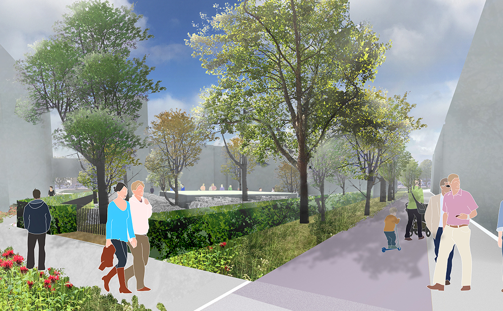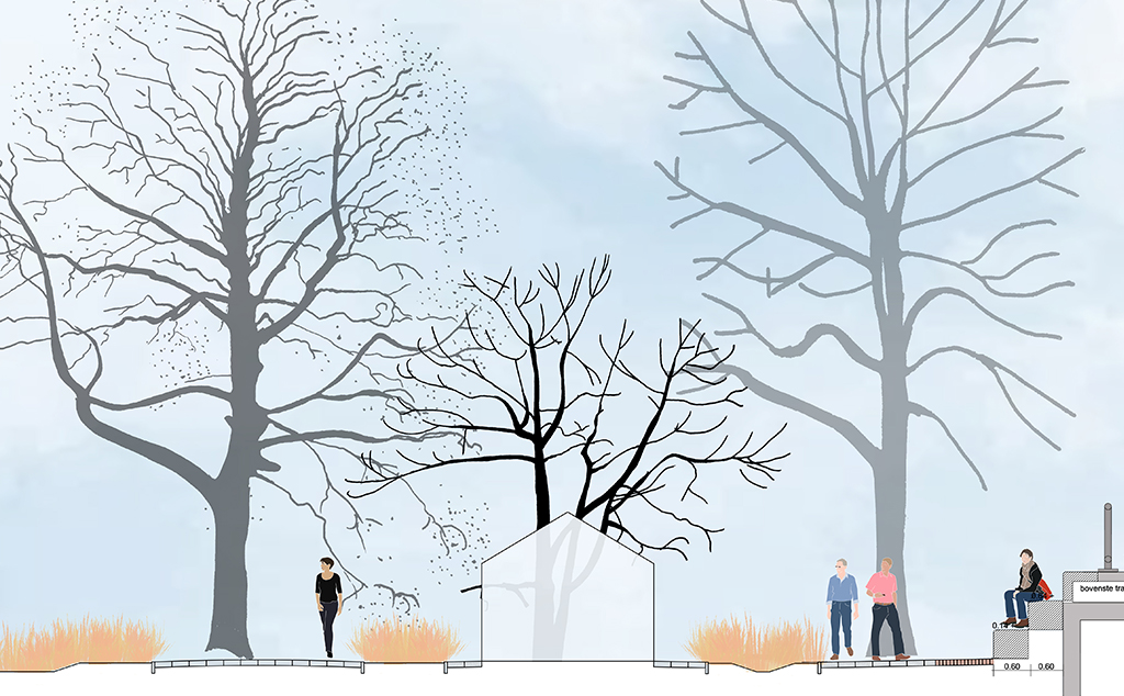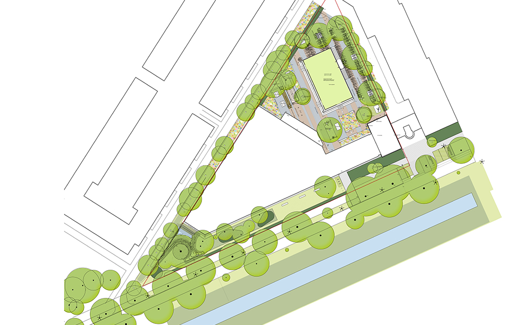 Over het plein zijn los bomen geplaatst. Ze staan los geplaatst en vormen in de toekomst een half open kroon. De bomen zorgen voor schaal en maat, koelte en een visuele filter. Type bomen passen bij de lokale ecologie (eik, iep, es, linde), de kleinere bomen dragen bij aan de tuin (yard) schaal: bloemen- vorm en bladkleur. De beplanting is een eenvoudige, te beheren mix van vaste planten, eenjarigen en bollen.