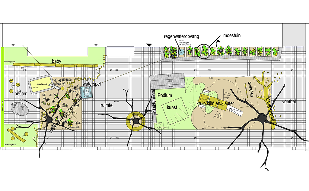 Het ontwerp is gebaseerd de gouden regels van Montessori. Dit is vertaald naar een patroon van lijnen en vlakken van verschillende grootte en loopt van gevel tot gevel. Het patroon zorgt voor orde en samenhang waarbinnen het grote programma is geplaatst en is tegelijkertijd een aanleiding tot spel en beweging. Binnen dit patroon zijn vlakken met een andere textuur gemaakt; kunstgras, een driedimensionale klimbult en houtsnippers. Op dit plein zijn los allerlei speelobjecten, speelaanleidingen, een podium, moestuintjes en het kunstwerk geplaatst. Toch onderling verbonden zodat er een reeks ontstaat van aanleidingen, route voor beweging.