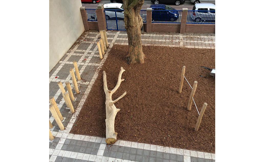 Het plein is opgedeeld in een schoolpleinen een plein voor de BSO. Samen een plein van 800 m2. De scheiding tussen beide pleinen is natuurlijk vormgegeven met houten palen. Op het plein wordt het regenwater opgevangen, is er een moestuin en is het bestaande groen geïntegreerd.