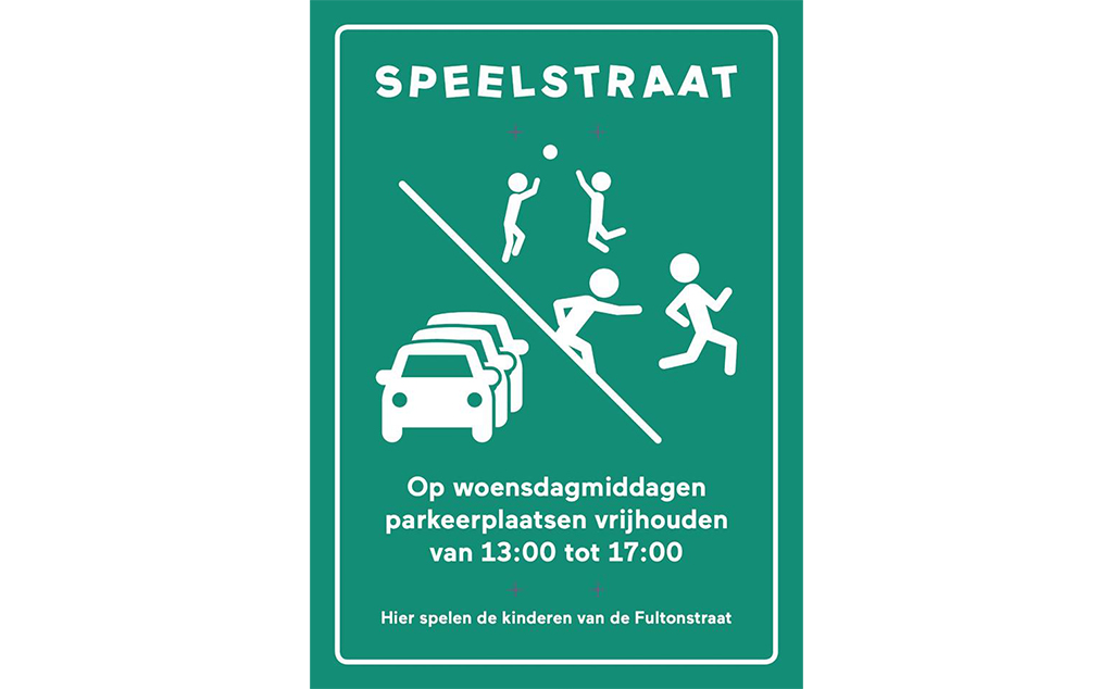 In de Fultonstraat kan op straat gespeeld worden. In de straat staat een bord met het verzoek om op woensdag middag niet te parkeren. Nu kunnen de kinderen op straat spelen door dubbel ruimtegebruik.